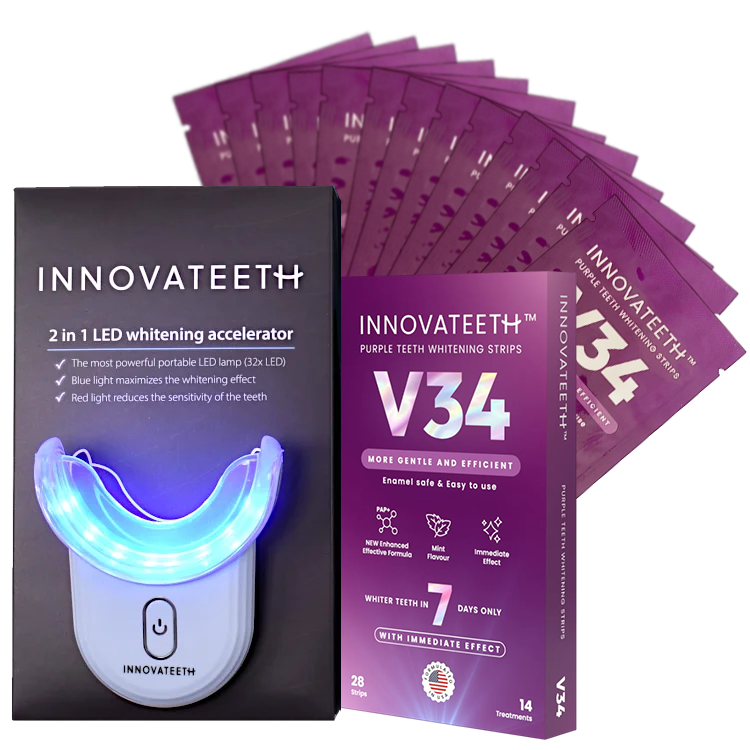 Vyzkoušejte fialové bělicí pásky Innovateeth™ V34 s inovativní PAP+ technologií, která účinně zesvětluje zuby bez poškození skloviny.